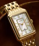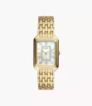 A true icon from our archives, the rectangular Raquel watch is updated for the current moment. Slim and versatile, it features a mother-of-pearl watch face with a glitz inner-frame, three-hand date movement and a brushed and polished gold-tone 7-link bracelet.