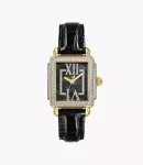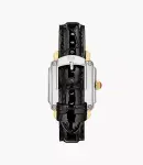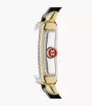 The Deco Madison Mid Pavé Roman watch blends timeless design with modern detail. Its 31mm rectangular case, crafted from 18K two-tone gold-plated stainless steel, is framed by 231 hand-set diamonds totaling 0.76 carats. A black mother-of-pearl dial with diamonds and pavé roman numeral accents is paired with a glossy black croco-embossed leather strap and is interchangeable with any 16mm MICHELE bracelet. Finished with a sapphire crystal and powered by Swiss quartz movement, this piece is both elegant and functional.
