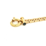 Indulge in timeless elegance with our 18K Yellow Gold Greek Key Link Bracelet, a masterpiece of luxury and sophistication. This exquisite piece features intricately designed Greek key motifs that symbolize infinity and unity, making it a meaningful addition to your jewelry collection. The bracelet is adorned with stunning cabochon sapphire end caps, adding a touch of rich, deep blue that contrasts beautifully with the warm glow of yellow gold. Measuring 6.5 inches, it offers a comfortable fit for daily wear or special occasions. Whether you're dressing up for a gala or adding a touch of luxury to your everyday ensemble, this bracelet is sure to captivate and charm. Embrace a piece that speaks volumes about your refined taste and appreciation for classic design.