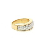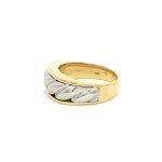 Elevate your elegance with our exquisite 18K Yellow Gold & Platinum Ring, designed for those who appreciate timeless sophistication. This luxurious piece features a captivating dual-tone design, seamlessly blending the warmth of yellow gold with the cool allure of platinum. Perfect for special occasions or adding a touch of everyday elegance, this ring is a statement of refined taste. The intricate braided pattern adds a unique texture, ensuring it catches the light beautifully from every angle. Available in size 9, this ring is crafted for comfort and style, making it a versatile addition to any jewelry collection. Embrace the art of elegance and let this stunning piece become a cherished part of your ensemble.