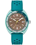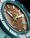 Continuing Bulova’s tradition of innovation and fine craftsmanship, our new Snorkel collection blends vintage-inspired design with a fresh, modern twist. The reimagined Bulova Snorkel shares DNA with the iconic Oceanographer through its classic yet recognizable case shape. In vibrant hues inspired by marine life, each 41mm timepiece features a retro case shape made with a new innovative Hybrid Ceramic—a composite material that feels luxuriously smooth with enhanced durability. This model’s wave-pattern brown dial and striking hybrid case pair perfectly with the green unidirectional bezel with a bi-color insert and a case back etched with an image of a Sea Turtle, paying homage to its oceanic roots. With silver-tone hands and markers with luminescent fill, a date display, and a matching green perforated rubber strap, the men’s Snorkel embodies timeless design, and with 100m water resistance, it perfectly balances style and functionality with Bulova’s legacy of iconic watchmaking.