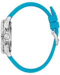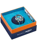 Ushering in a new era of electric boat racing, the Team Miami E1 Racing Marine Star B commemorates E1’s Team Miami and the E1 Championship. The striking timepiece designed in the Team Miami E1 colors features a silver-tone stainless steel case with a flat sapphire crystal with anti-reflective coating and 100m of water resistance, a custom logo case back, and a leather and silicone rubber strap that coordinates with the dial. The blue dial has silver-tone applied markers and hands with Super-LumiNova luminescent fill, bright green accents, a date display, and orange and silver-tone subdials, including registers allowing timing to 1/20 of a second. As the?official timekeeping partner of E1 Team Miami, Bulova presents this special edition timepiece in its custom designed box inspired by this exhilarating new frontier of speed.