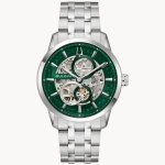 Experience wonder with a Bulova men’s Sutton Automatic timepiece that shows off its complex inner workings. Sculptural and organic, the dynamic silver-tone stainless steel case features a blend of finishes to create a striking presence on the wrist, with a sapphire crystal ensuring optimal clarity. Multilayered and blending complementary finishes, the open green dial is set with applied indices and matching hands with luminescent fill. The dial reveals the captivating mechanics of the 21-jewel skeletonized automatic movement, which offers 42-hours of power reserve. Completed with a matching multi-link stainless steel bracelet, this Bulova men’s watch is the perfect choice to elevate your style.