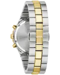 Bold, modern design characterizes this 6-hand chronograph from the Classic Bulova Prestige men’s collection. The watch features a faceted 40mm gold- and silver-tone stainless steel case with a geometric bezel, flat sapphire crystal with anti-reflective coating, 100m of water resistance, and a chamfered 3-link bracelet with a combination of brushed and polished finishes and a push-button deployant closure. The silver-white striped dial has gold-tone hands and applied markers with Super-LumiNova luminescent fill, a date display, and sub-dials including a 24-hour display. Highly functional with a distinctive design, this timepiece is suited for any occasion, from the everyday to the extraordinary.