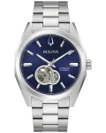 Part of the Surveyor line of Bulova watches, this updated classic automatic watch offers all of the detail and quality you would expect in a luxury watch, while staying at an affordable price point. The stainless steel case and bracelet are paired with a blue three-hand dial with silver-tone accents and an open aperture to view the movements balance wheel and escapement. The screw-back case is topped with a mineral crystal exhibition window to showcase the automatic movement powering the timepiece. This beautifully detailed, quality timepiece is destined to become a new favorite in any collection.