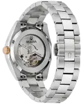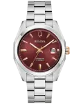 The Bulova men’s Surveyor is defined by exceptional quality and sophisticated aesthetics. The silver-tone stainless steel case features sculpted edges and faceting which provide an effortless wear on the wrist, with polished and brushed finishing, a flat sapphire crystal, and a matching quick-release 3-link stainless steel bracelet with a push-button deployant clasp. The rich burgundy dial has a sunburst finish and features rose gold-tone accents, hands with luminescent fill, debossed minute markers, and a magnified date display. The watch is powered by an 21-jewels and a 42-hour power reserve, which can be seen in full through a mineral crystal exhibition window in the caseback. For those with a discerning eye for refined luxury, this Bulova men’s timepiece is the obvious choice.
