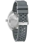 Continuing Bulova’s tradition of innovation and fine craftsmanship, our new Snorkel collection blends vintage-inspired design with a fresh, modern twist. The reimagined Bulova Snorkel shares DNA with the iconic Oceanographer through its classic yet recognizable case shape. In hues inspired by marine life, each 41mm timepiece features a retro case shape made with a new innovative Hybrid Ceramic—a composite material that feels luxuriously smooth with enhanced durability. This model’s wave-pattern white dial and striking hybrid case pair perfectly with a gray unidirectional bezel with a bi-color insert and a case back etched with an image of a Great White Shark, paying homage to its oceanic roots. With silver-tone hands and markers with luminescent fill, a date display, and a matching gray perforated rubber strap, the men’s Snorkel embodies timeless design, and with 100m water resistance, it perfectly balances style and functionality with Bulova’s legacy of iconic watchmaking.