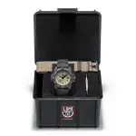 The Navy SEAL Foundation RSC watch from Luminox brilliantly maximizes a trio of distinct materials to make a watch built for maximum durability. The stainless-steel case is adorned with a robust CARBONOX™ bezel and tied together with a black, genuine rubber strap, allowing this timepiece to perform at top levels regardless of environment. The sand-colored dial is a subtle homage to the SEALs and their desert-based campaigns of the past two decades. This watch comes packaged as a set, on a black rubber strap, packed in a box with an additional sand-colored strap and strap-changing tool.