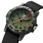 The Leatherback Sea Turtle Giant Turtle watch gets it's name from the design of the watch, the classic Luminox case with the proteced crown balanced by an opposite outcropping, resembles the shape of a turtle. The 44mm case is made of durable and lightweight signature CARBONOX™ and is water resistance up to 100 meters. The green dial with orange accents provides highlights. Its proven Luminox Light Technology lighting system guarantees self-powered readability in the night. "Always Visible" for 25 years.