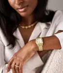 Inspired by the geometric shapes of Art Deco architecture, this 18K gold-plated Deco Mid shines with 126 hand-set diamonds (0.57 carat weight) on the bezel and atop the white mother-of-pearl dial adorned with double diamond hour markings. The signature MICHELE crown accents this stunning timepiece with a Swiss movement and the iconic seven-link 18K gold-plated bracelet is interchangeable with any 16mm MICHELE strap.