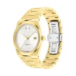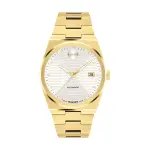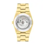 39mm pale gold ionic-plated stainless steel case and bracelet with white dual texture dial, yellow gold-tone hands, and exhibition case back. Swiss automatic movement.