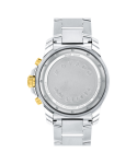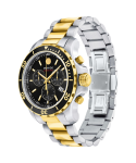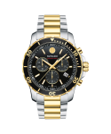 Movado Series 800, 42 mm stainless steel and yellow gold PVD-finished case and bracelet with black chronograph dial.