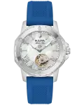 Embrace a bold new you with the sporty Bulova ladies’ automatic Marine Star. The silver-tone stainless steel case features an engaging blend of finishes for a dynamic presence on the wrist, while the sapphire crystal and protected crown provide modern reliability which is furthered by 100m of water resistance. The lustrous mother-of-pearl dial features silver-tone accents, with roman numeral hour markers and dramatic hands with luminescent fill to ensure legibility in every situation. On the lower half of the dial, a silver-tone ring frames an aperture offering a glimpse at the beating heart of the slim premium automatic movement, which features 24 jewels and a 42-hour power reserve. Completing the timepiece is a blue quick-release silicone strap which provides exceptional comfort and security. With its elegant luxury and mechanical soul, this Bulova ladies’ timepiece is sure to carry you through the day in timeless style.